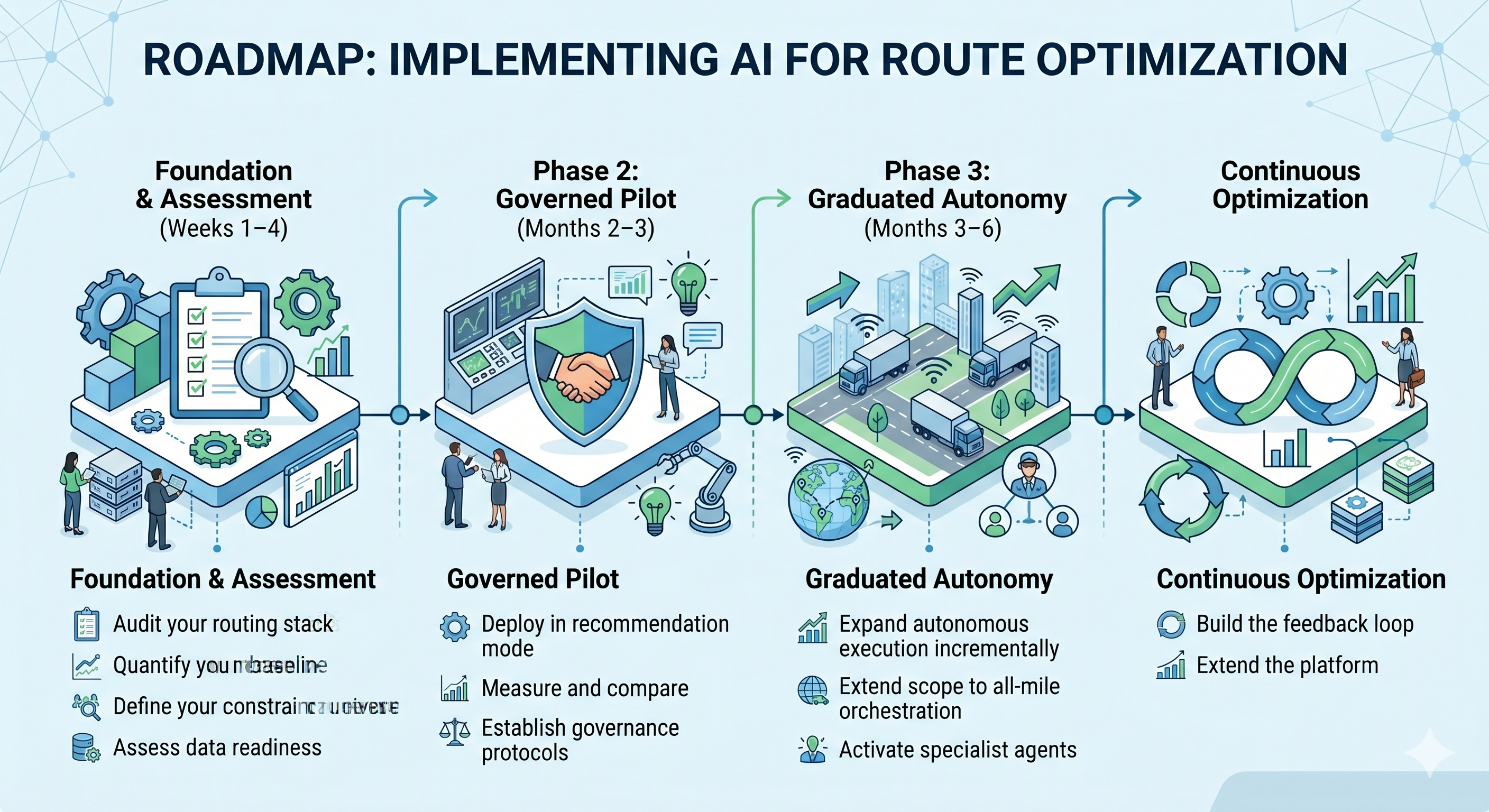 Implementation follows four phases: (1) Foundation — audit your routing stack, quantify baselines, and map your constraint universe (weeks 1–4). (2) Governed Pilot — deploy in recommendation mode alongside existing systems and measure performance deltas (months 2–3). (3) Graduated Autonomy — expand autonomous execution incrementally on proven lanes, then extend to all-mile scope (months 3–6). (4) Continuous Optimization — build feedback loops and extend the platform as a configurable software factory.