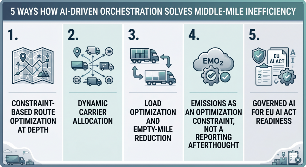 AI orchestration reduces middle-mile costs through four mechanisms: constraint-based route optimization processing 180+ variables simultaneously (vs. 10–20 in ERP modules), dynamic carrier allocation across fragmented fleet networks, load consolidation that reduces 25% empty running and improves 60% load factors, and emissions-per-route optimization that makes CSRD Scope 3 compliance an operational byproduct. Enterprise implementations deliver 15–20% logistics cost reductions within months.