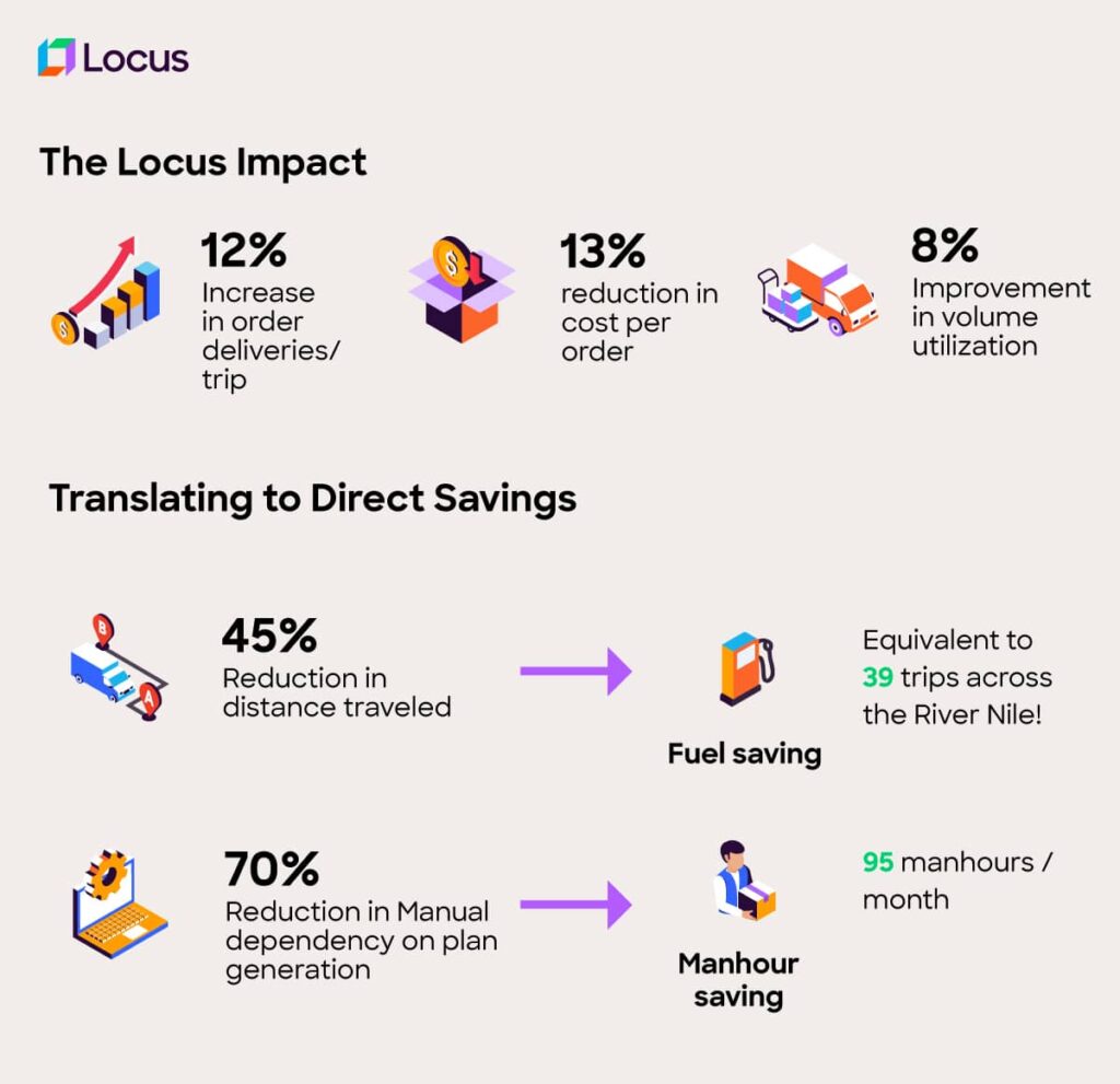 - Locus’s dispatch management platform helped the company optimize delivery routes and reduce transit times, resulting in 45% reduction in distance traveled while managing logistics contracts more effectively.