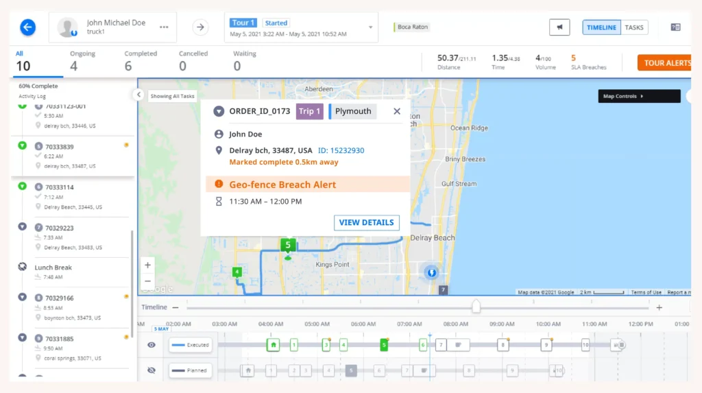 - No way to monitor route and SLA breaches: Legacy systems don’t have a built-in geofencing feature that sends notifications to dispatchers about any route deviations by drivers. Neither can they spot factors like peak traffic, rains, blockades, etc which can hinder SLAs.