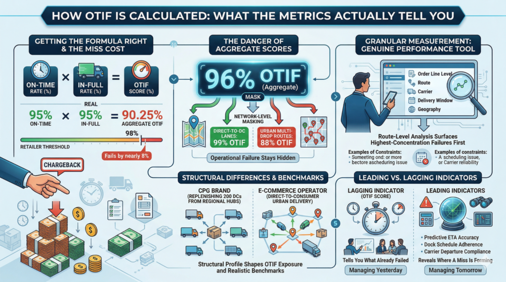 A retailer running 96% OTIF at the network level may be running 88% OTIF on urban multi-drop routes and 99% on direct-to-DC lanes. The aggregate number passes. The operational failure stays hidden.