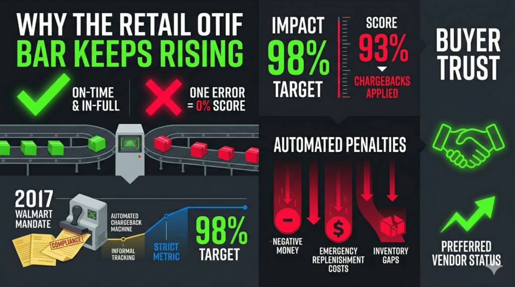 Walmart’s 2017 OTIF mandate changed the metric’s meaning for supplier operations. Before the mandate, OTIF was tracked internally by most retailers as a planning metric with informal accountability. Walmart codified it as a supplier compliance standard with financial penalties for any score below 75%, later tightened to 98%, and backed it with an automated chargeback system. Other major retailers followed.