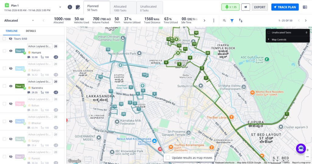 With AI-powered optimization, configurable constraints, and rapid computation capabilities, route plans can be generated in minutes helping businesses reduce costs, improve utilization, and consistently meet SLAs.