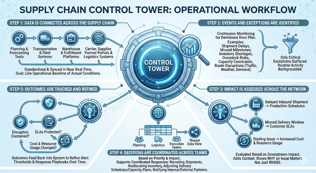 By integrating supply, production, and logistics signals, control towers help organizations assess downstream impacts and coordinate responses across interconnected operations.
